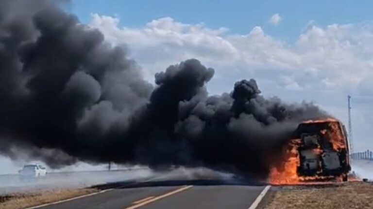 O Corpo de Bombeiros atua na ocorrência e as equipes já controlaram as chamas para liberar parte do trânsito