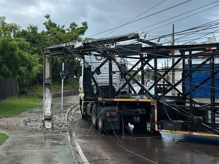 Poste cai por cima de caminhão após colisão na Zona Norte de Aracaju