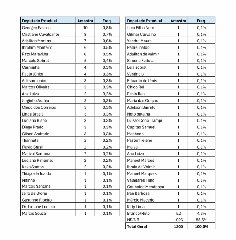 Confira o resultado completo da pesquisa para a Assembleia Legislativa: