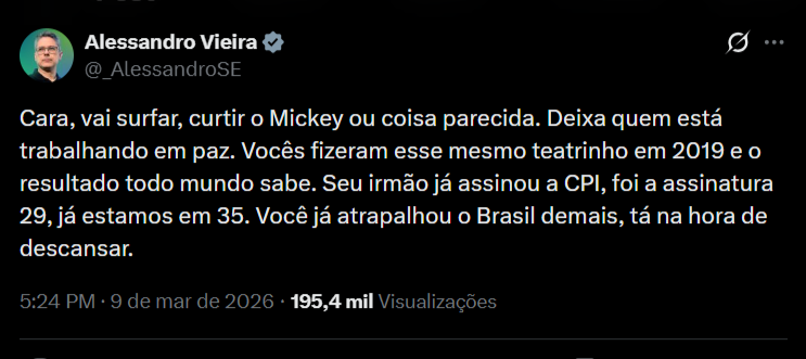“Cara, vai surfar, curtir o Mickey ou coisa parecida. Deixa quem está trabalhando em paz. Vocês fizeram esse mesmo teatrinho em 2019 e o resultado todo mundo sabe. Seu irmão já assinou a CPI, foi a assinatura 29, já estamos em 35. Você já atrapalhou o Brasil demais, tá na hora de descansar.”