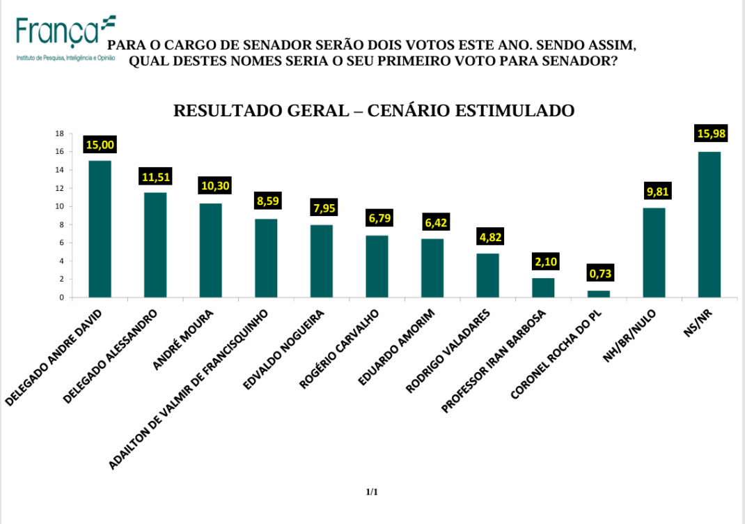Na eleição para o Senado em 2026, serão disputadas duas vagas, e cada eleitor poderá votar em dois candidatos. No levantamento do Instituto França, considerando a primeira opção de voto, quem lidera é o delegado André David, com 15% das intenções. O pré-candidato anunciou sua candidatura apenas no início de abril — sua intenção inicial era disputar uma vaga na Câmara dos Deputados — e já surge na liderança.