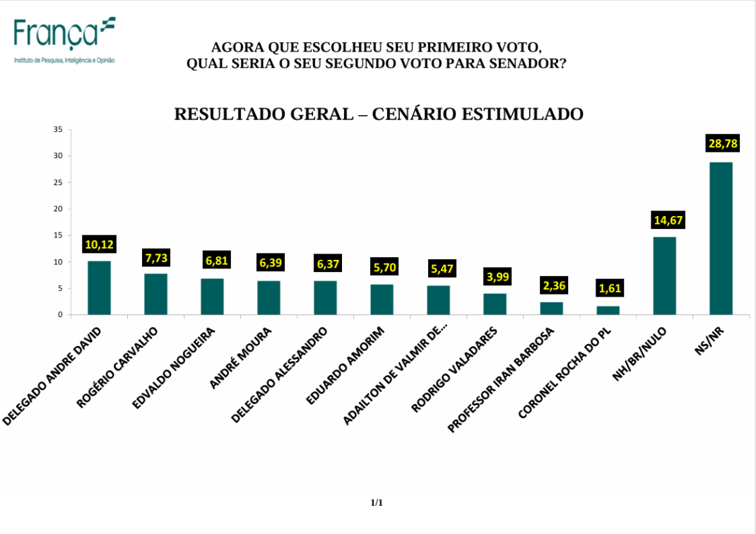 Como a segunda opção dos sergipanos para o Senado, o delegado André David se mantém na liderança com 10,12% das intenções de votos, seguido pelo senador Rogério Carvalho com 7,73% e Edvaldo Nogueira com 6,81% das intenções de votos. Confira todos os números do segundo voto abaixo: