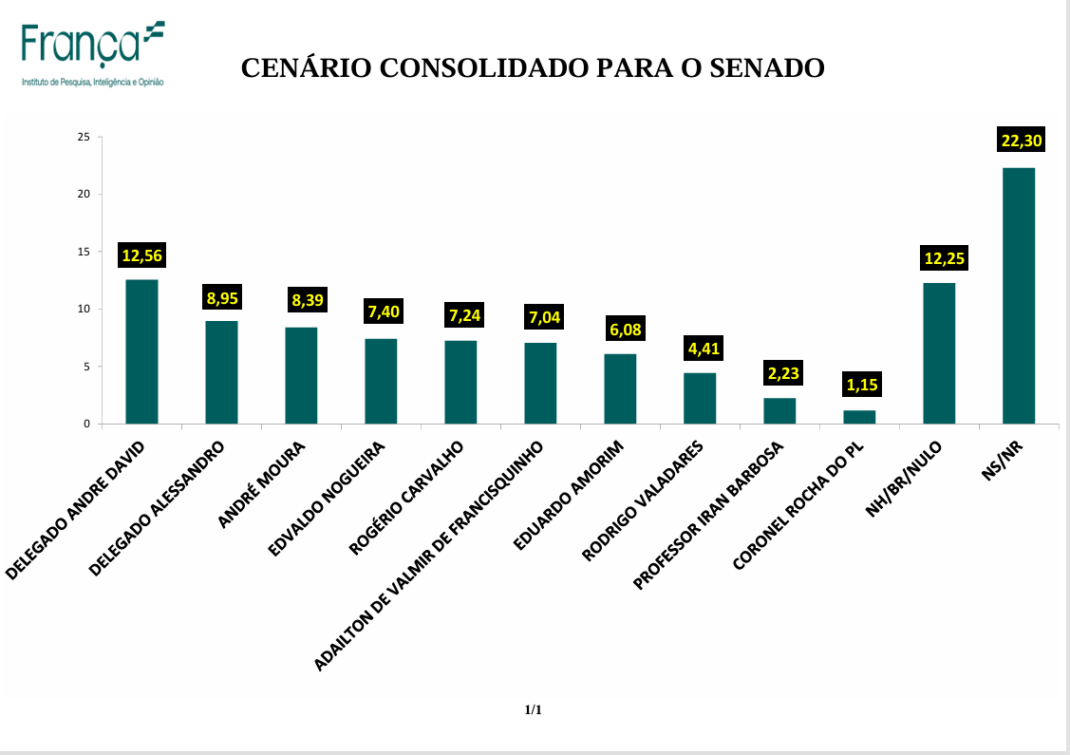 No cenário consolidado – quando soma-se os dois votos que cada entrevistado assinalou – os dois pré-candidatos eleitos, caso a eleição fosse hoje, seriam: os delegados André David, com 12,56% das intenções de votos consolidados, e Alessandro Vieira, com 8,95% das intenções de votos. Os pré-candidatos André Moura, com 8,39% das intenções de votos, e Edvaldo Nogueira, com 7,40% das intenções de votos, que ocupam a terceira e a quarta posição, respectivamente, na pesquisa.