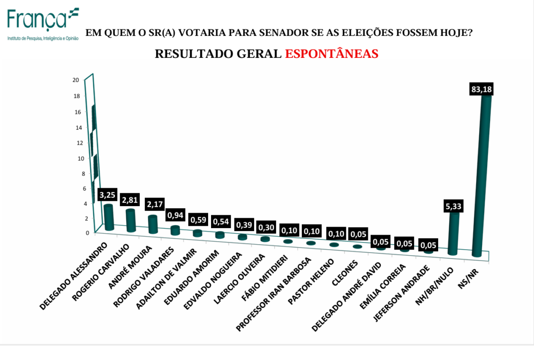 No cenário espontâneo – quando não é apresentado nenhum nome ao entrevistado – quem lidera a intenção de voto é o delegado Alessandro (MDB) com 3,25%, seguido do petista Rogério Carvalho com 2,81%, e logo após André Moura (UNIÃO) com 2,17%. Os demais apresentam intenções de votos abaixo de 1%. O cenário espontâneo sinaliza que o eleitorado já tem em mente em quem irá votar nas eleições 2026.