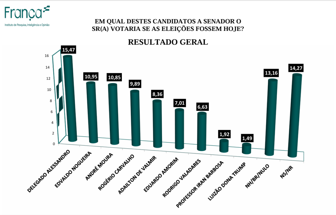 Na eleição para o Senado nas eleições 2026 serão disputadas duas vagas, logo o eleitor votará em duas opções. No levantamento do Instituto França para a primeira opção de voto ao Senado quem lidera é o delegado Alessandro Vieira com 15,47%, seguido de Edvaldo Nogueira com 10,95%. Em terceiro lugar está André Moura que tem 10,85%, seguindo por Rogério Carvalho com 9,89%. Adailton de Valmir apresenta 8,36% das intenções de voto, enquanto Eduardo Amorim tem 7,01% das intenções de votos. O bolsonarista Rodrigo Valadares apresenta apenas 6,63% e está nas últimas posições, segundo a pesquisa.