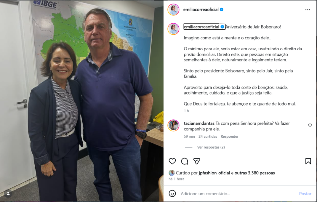 Na publicação, além de desejar feliz aniversário, a prefeita defende que Bolsonaro tenha o direito à prisão domiciliar, dado o seu estado de saúde.