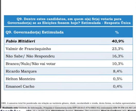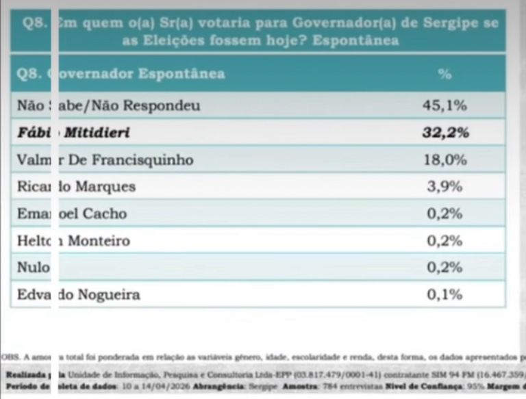Já no cenário espontâneo — quando os nomes não são apresentados — Mitidieri também lidera, com 32,2% das citações. Valmir de Francisquinho aparece com 18%, seguido por Ricardo Marques, com 3,9%. Nesse formato, o número de indecisos é mais elevado, chegando a 45,1%.