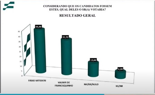Na disputa direta entre Fábio Mitidieri e Valmir de Francisquinho pelo Governo de Sergipe, o atual governador leva vantagem. Segundo a pesquisa, 44,44% dos entrevistados optam por Fábio Mitidieri, enquanto 35,70% escolhem o prefeito de Itabaiana, Valmir de Francisquinho — uma diferença de 8,74 pontos percentuais.