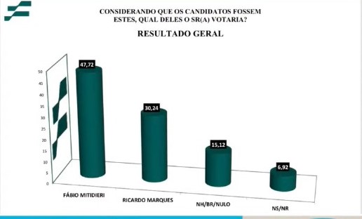 Nos confrontos com o vice-prefeito de Aracaju, Ricardo Marques, e o deputado federal Thiago de Joaldo, a vantagem de Fábio Mitidieri é ainda maior. Na disputa direta com Ricardo Marques, a pesquisa aponta que o governador obtém 47,72% das intenções de voto, enquanto 30,24% dos aracajuanos preferem Ricardo Marques para governador a partir de 2027.