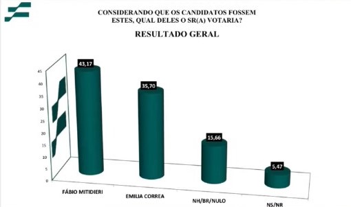 No confronto com a prefeita de Aracaju, Emília Corrêa, o governador também venceria, caso as eleições fossem hoje, restritas à capital sergipana. Fábio Mitidieri teria 43,17% dos votos, enquanto Emília Corrêa alcançaria 35,70% dos eleitores aracajuanos, uma diferença de 7,47 pontos percentuais a favor do governador — ligeiramente menor do que a registrada na disputa com o prefeito de Itabaiana.