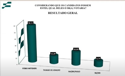 No levantamento entre Fábio Mitidieri e Thiago de Joaldo, o governador tem 58,11% das intenções de voto do eleitorado aracajuano, contra 12,20% do deputado federal. Entre os confrontos apresentados pelo IFP, essa é a disputa em que Mitidieri possui a maior vantagem em relação ao adversário.