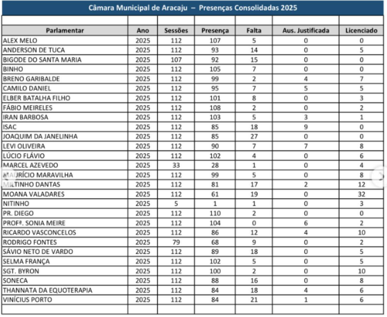 A análise da frequência dos vereadores é um dos indicadores utilizados para avaliar o desempenho legislativo, já que a participação nas sessões é fundamental para a discussão e votação de projetos de interesse da população de Aracaju.