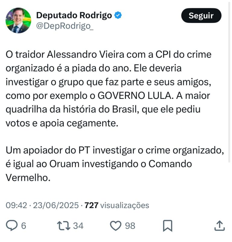 “O traidor Alessandro Vieira com a CPI do crime organizado é a piada do ano. Ele deveria investigar o grupo que faz parte e seus amigos, como por exemplo o GOVERNO LULA. A maior quadrilha da história do Brasil, que ele pediu votos e apoia cegamente. Um apoiador do PT investigar o crime organizado, é igual ao Oruam investigando o Comando Vermelho”, escreveu o deputado.