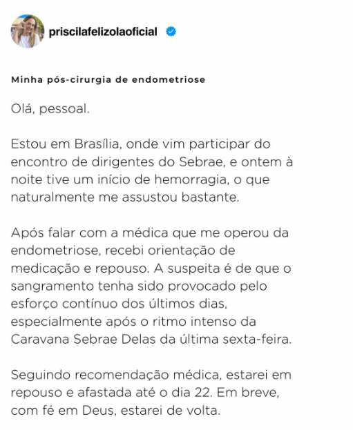 A superintendente do Sebrae Sergipe, Priscila Felizola, anunciou nesta terça-feira (17), por meio de suas redes sociais, que precisará se afastar temporariamente das atividades por motivos de saúde.