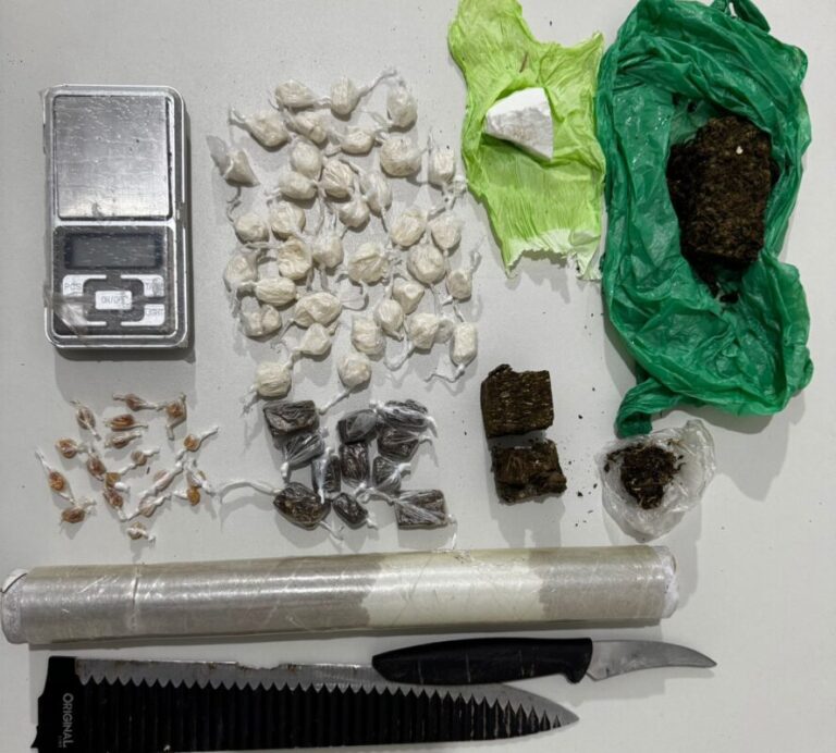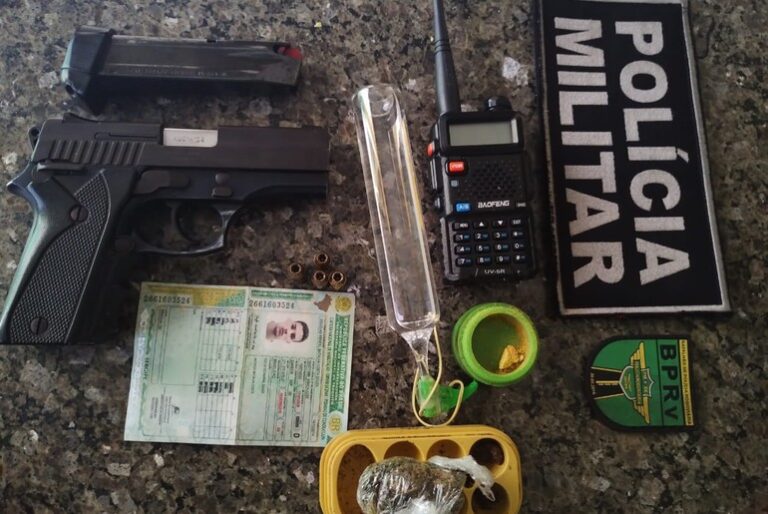 Durante a revista pessoal e veicular, os policiais encontraram uma pistola calibre .380, além de uma porção de substância análoga à maconha