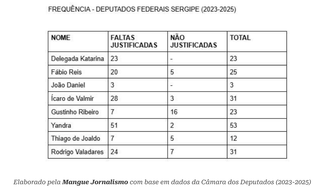 Os dados analisados pela reportagem, todos disponíveis ao público no site da Câmara (confira aqui), indicam que a deputada registrou 51 faltas justificadas e duas não justificadas, número superior ao de todos os demais integrantes da bancada de Sergipe na Casa.